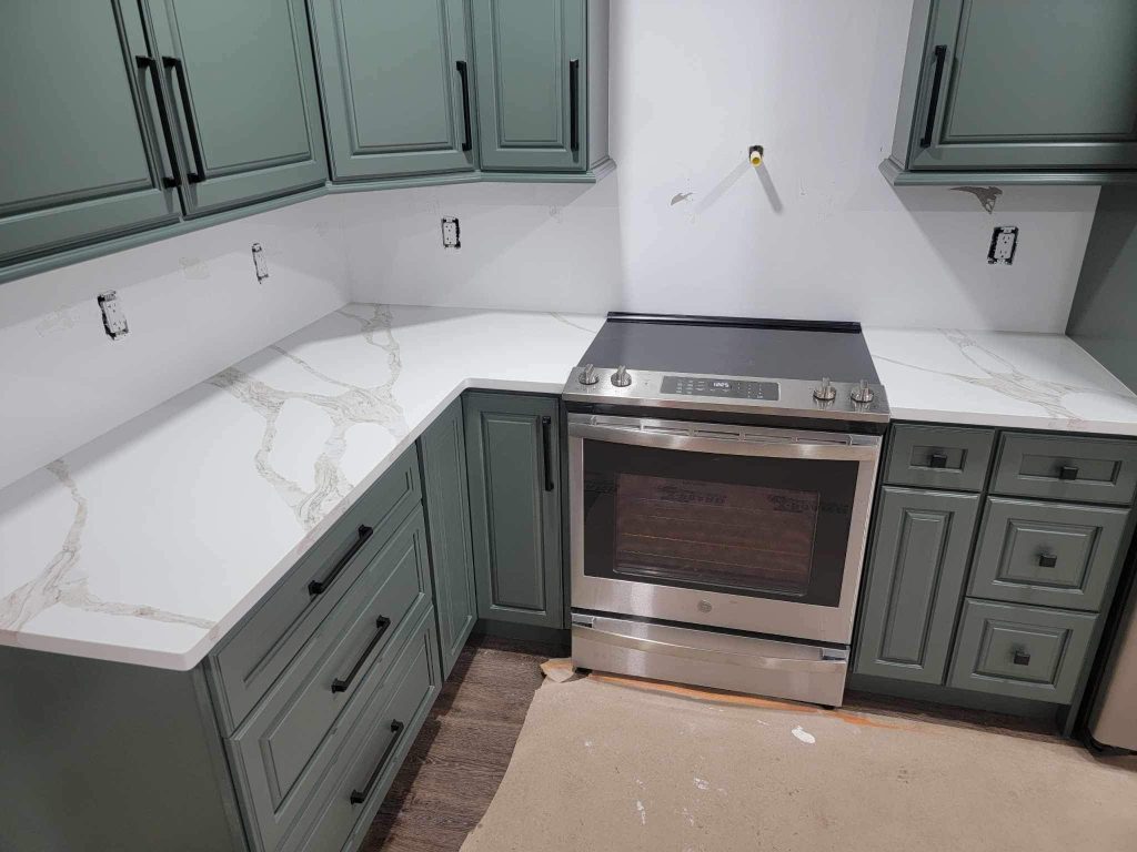 - Harmonious Blend: The combination of the quartz countertops and grey-green cabinets created a harmonious blend of colors and textures, elevating the kitchen’s aesthetic.